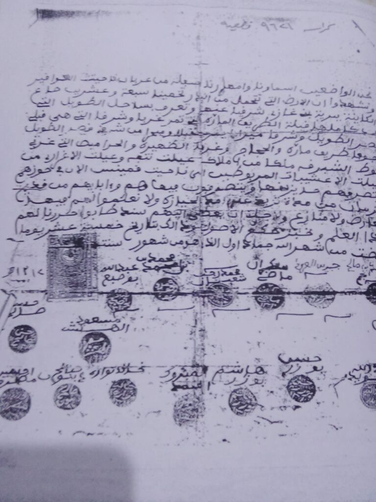 هذه صورة من إحدى المخطوطات التاريخية النادرة التي توثق جانبًا من تاريخ قبيلة العشيبات – بيت بولطعة.تمت إعادة طباعة هذه الوثيقة بدقتها الأصلية حفاظًا على الموروث التاريخي ولإبراز أسماء الأجداد الذين ساهموا في كتابة هذه السطور، شاهدين على مرحلة من تاريخ القبيلة.أعيد نشرها وفاءً للذاكرة وتخليدًا لجذورنا العريقة.